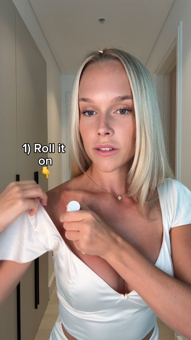 STEP 1: Roll Nuddya onto clean, dry skin or fabric where you’d like your clothes to stay in place. Apply a thin, even layer — less is more for light fabrics, add a little extra for thicker materials.